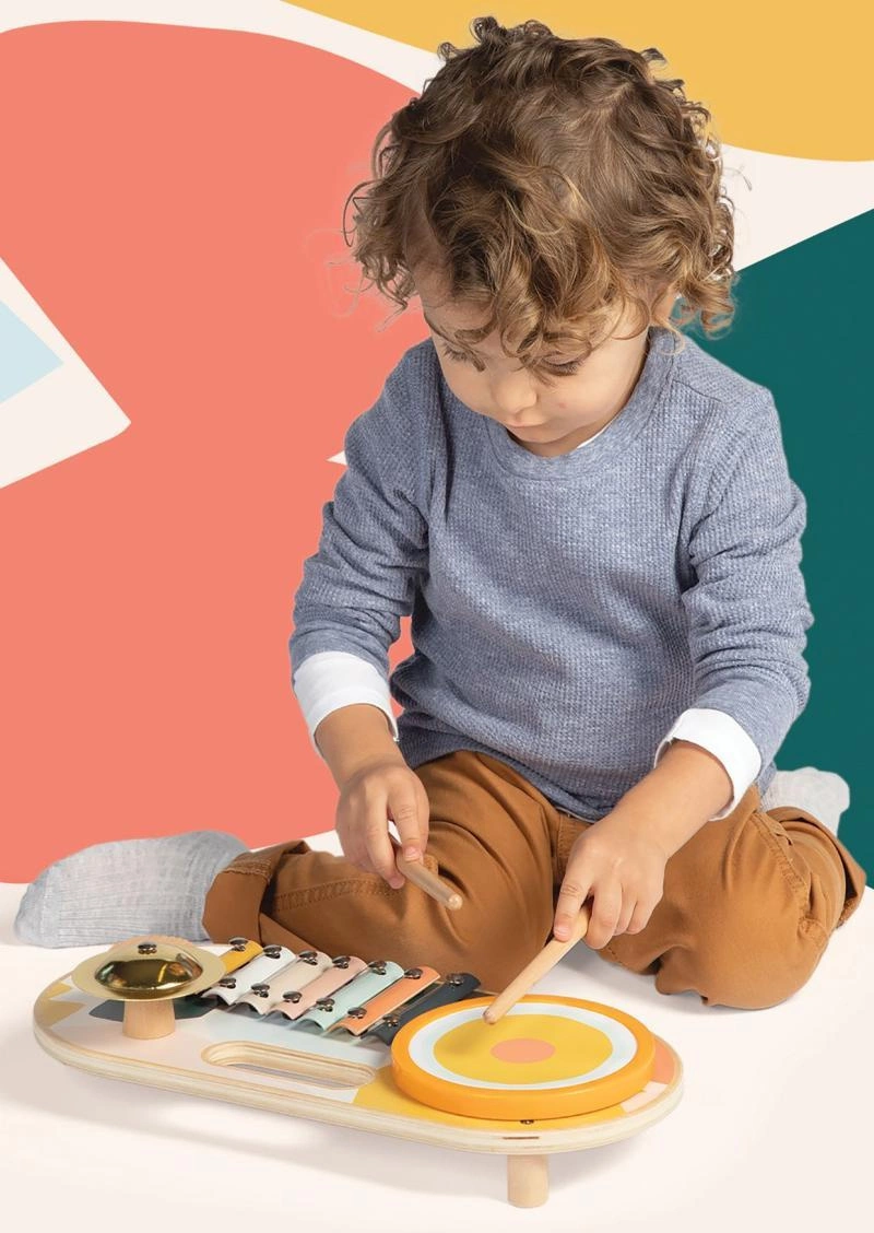 Manhattan Toy tym razem przenosi nas w świat dźwięków razem z zestawem muzycznym Beats to Go, który z pewnością zauroczy najmłodszych swoimi naturalnymi barwami i różnorodnością tonacji. Muzyczna zabawka wykonana na wysokim poziomie z drewna, z pełną dbałością o wszystkie detale i szczegóły. Posiada uchwyt do łatwego przenoszenia i trzy nóżki zapewniające stabilizację. Instrumenty muzyczne zawarte w zestawie to bębenek, para pałeczek, drewniany grzebień, talerz i 7-klawiszowy ksylofon.