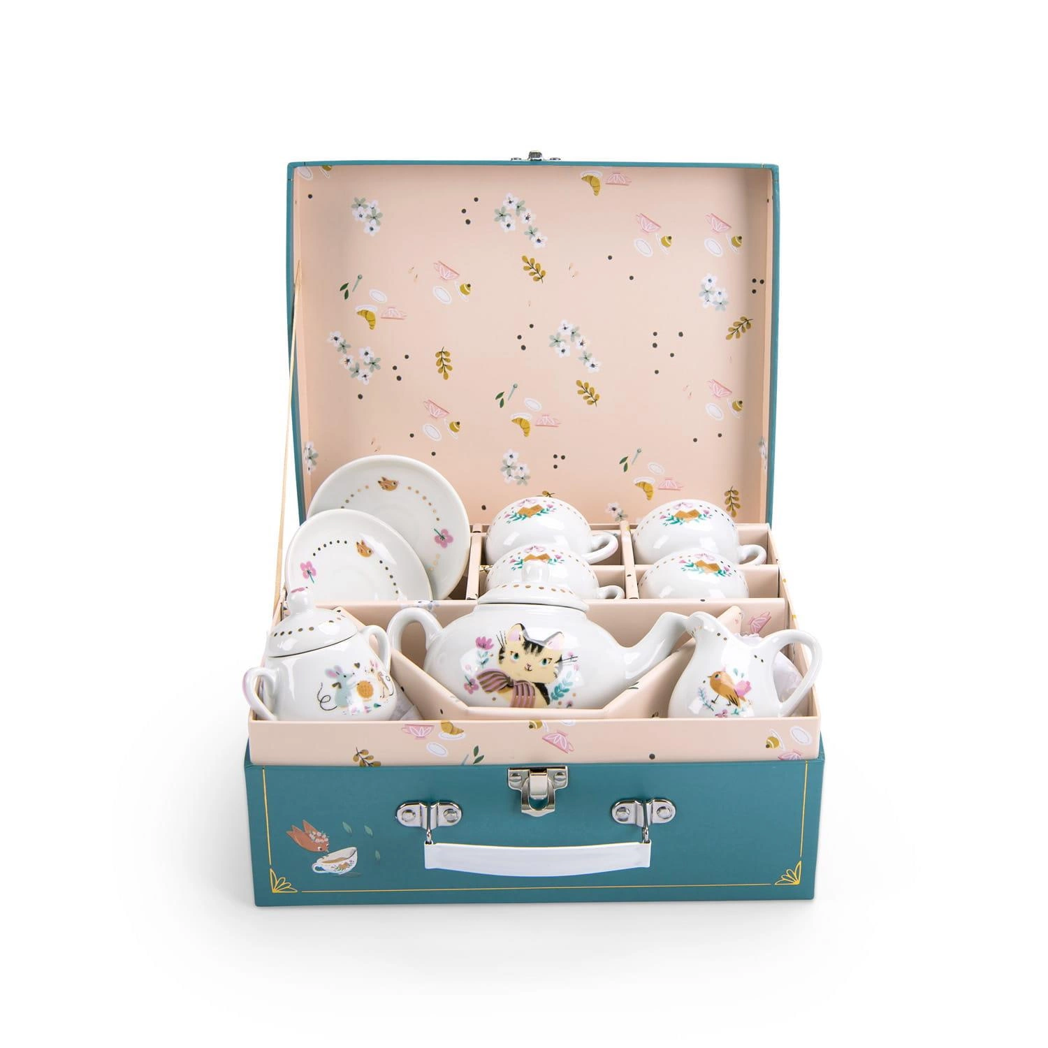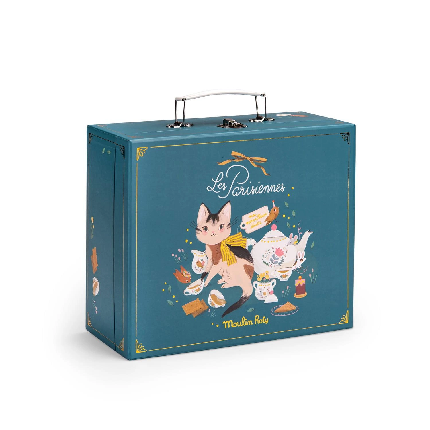 Zestaw naczyń ceramicznych z kolekcji Les Parisiennes z delikatnymi ilustracjami autorstwa Lucille Michieli. Zapakowany w pięknie zdobioną walizkę. Idealny do zabawy na role, wszystkie lalki i misie mogą się czuć zaproszeni na przyjęcie herbaciane. W zestawie znajdują się wszystkie niezbędne akcesoria do serwowania herbaty. Naczynia wykonane są z porcelany. Można je czyścić wilgotną ściereczką.