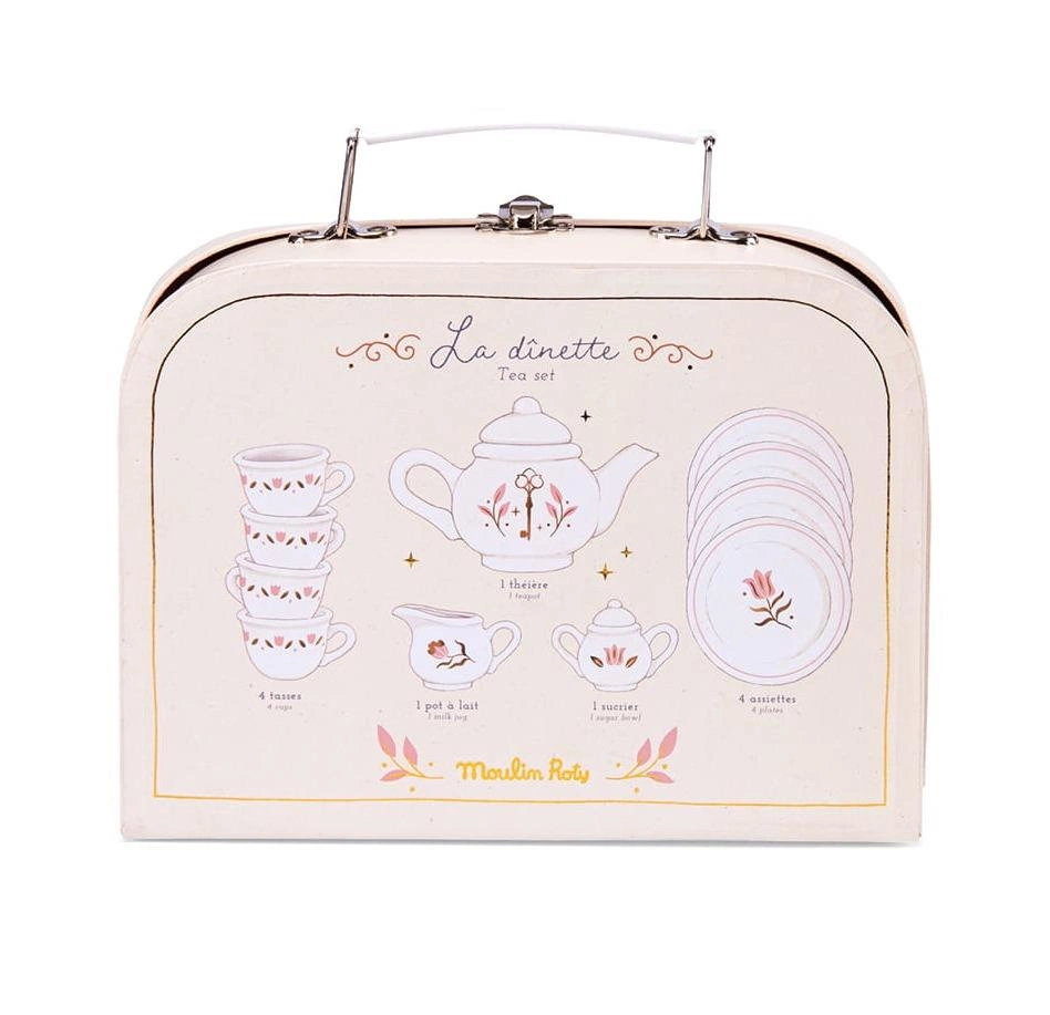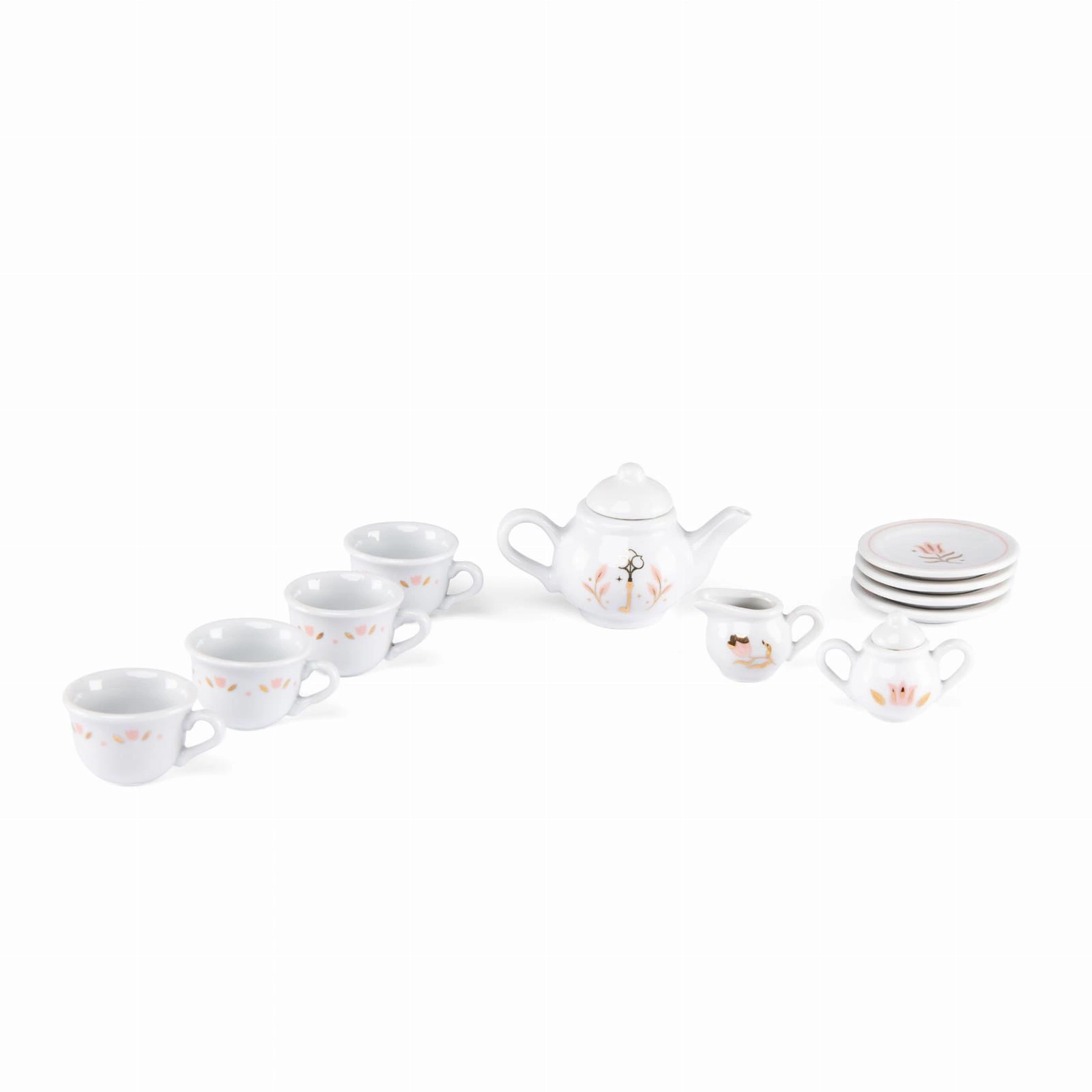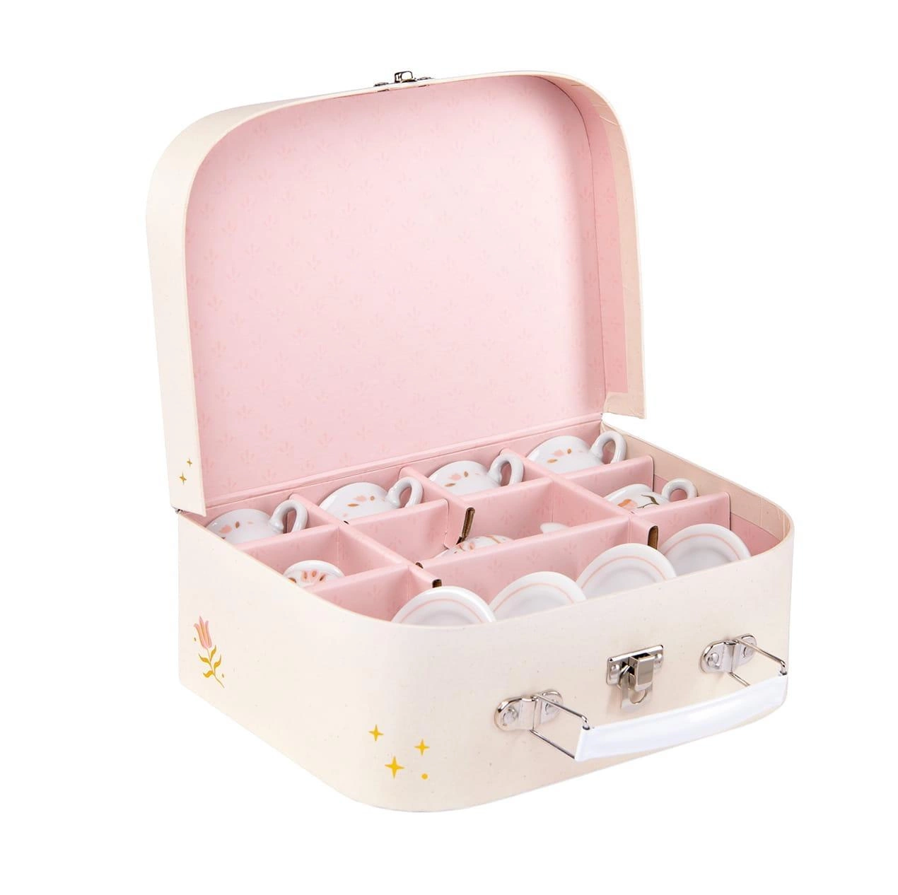Zestaw naczyń ceramicznych zdobionych delikatnymi różowymi i złotymi wzorkami. Idealny do zabawy na role. Wszystkie lalki i misie mogą czuć się zaproszeni na przyjęcie! Wszystkie niezbędne akcesoria do parzenia herbatki spakowane są w uroczą walizkę, która będzie stanowić piękną ozdobę dziecięcego pokoju. Naczynia można czyścić wilgotną ściereczką.