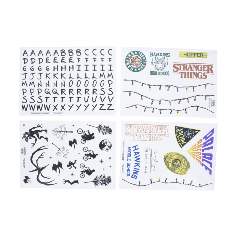 Zestaw zawiera cztery wysokiej jakości arkusze kalkomanii Stranger Things, w tym sylwetki postaci i potworów, arkusz liter zawierający pełny alfabet oraz logo między innymi komisariatu policji i liceum w Hawkins.