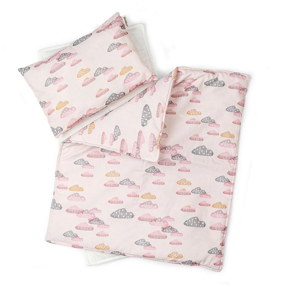 Ułóż lalkę tak, aby mogła spokojnie spać, nie marznąc. W zestawie znajduje się materac, kołdra i poduszka wysokiej jakości. Poduszka i kołdra mają uroczy wzór z miękkimi kolorowymi chmurkami. Zestaw idealnie pasuje do łóżka dla lalek.