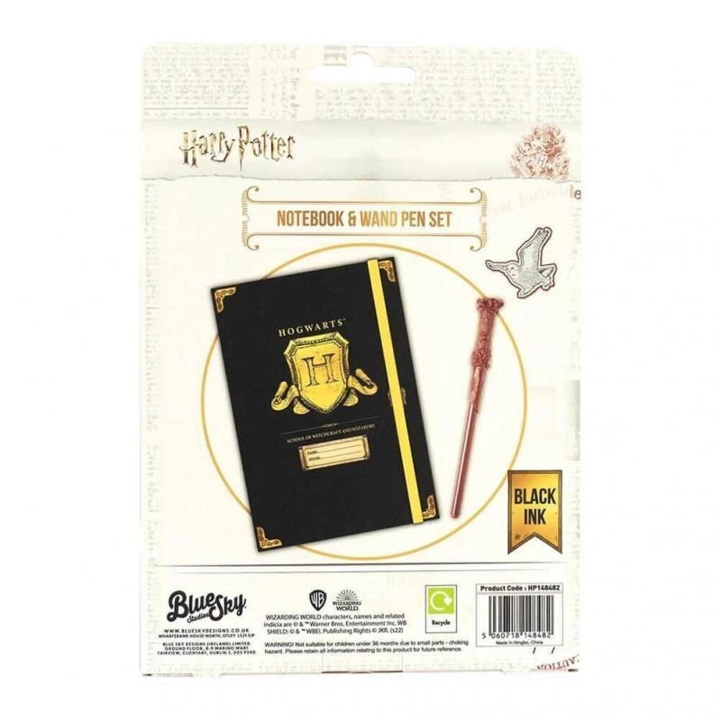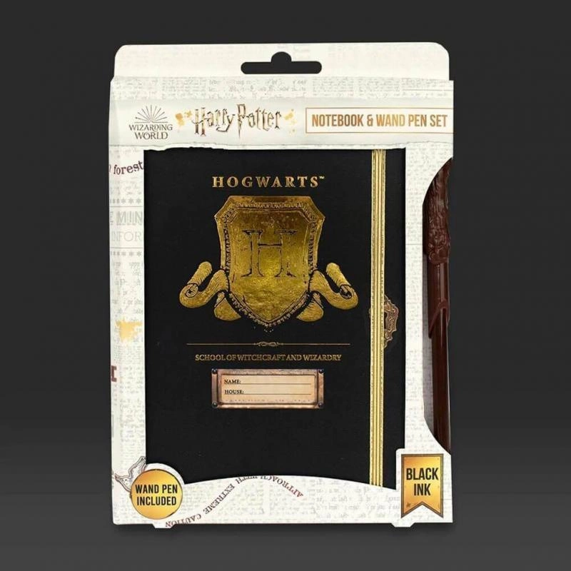 Zestaw zawiera zeszyt w oprawie A5 z tarczą Hogwartu oraz długopis z różdżką Harry'ego.