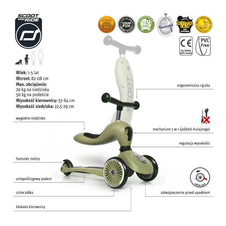 Zestaw SCOOTANDRIDE Highwaykick 1 2w1 Jeździk i hulajnoga 1-5 lat Olive Oliwkowy + Kask XXS OLIVE