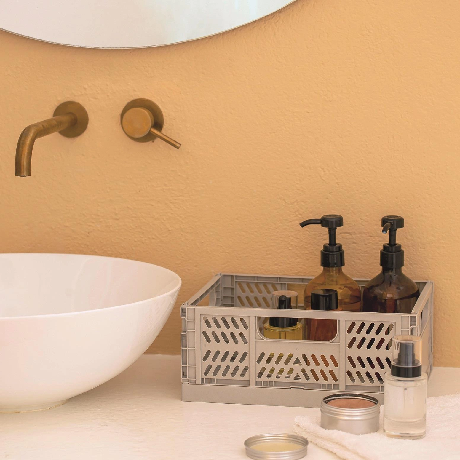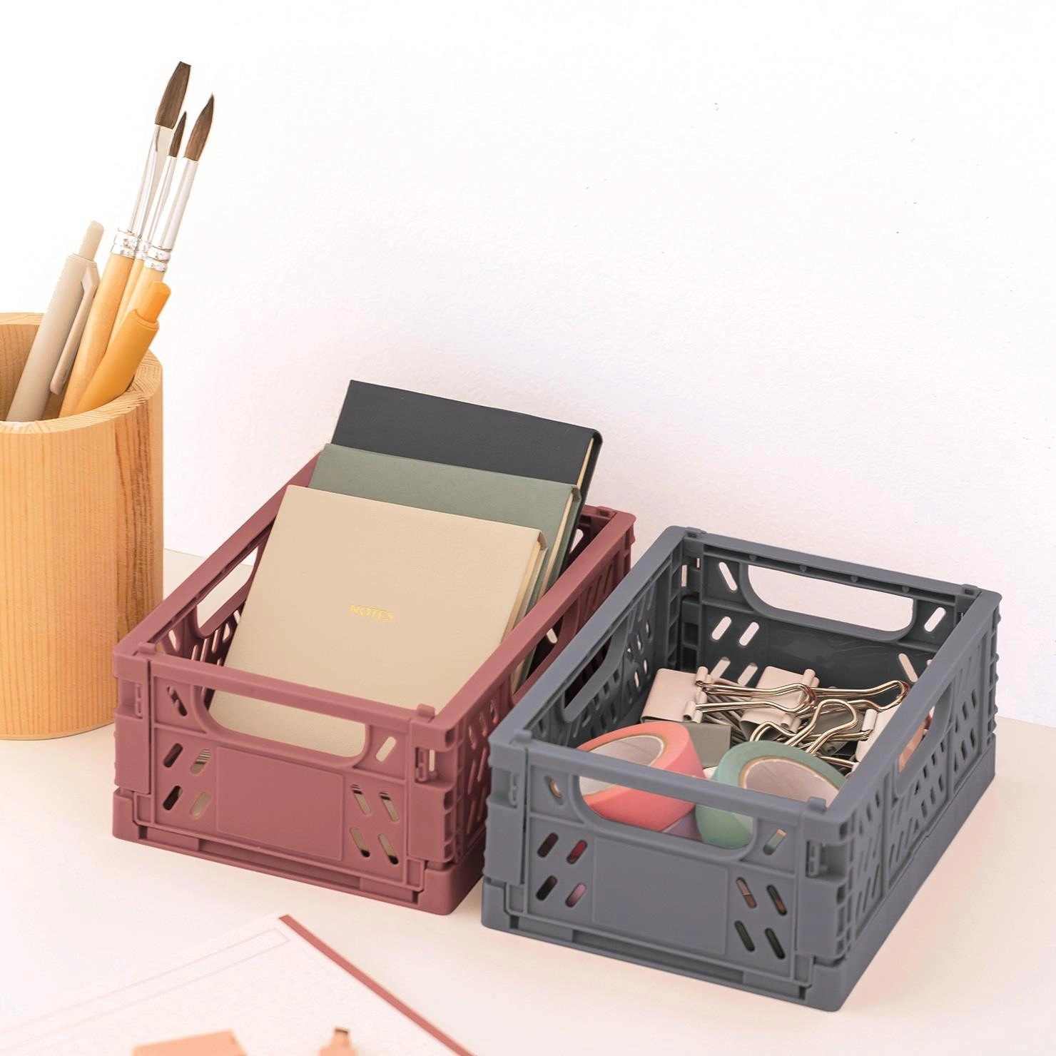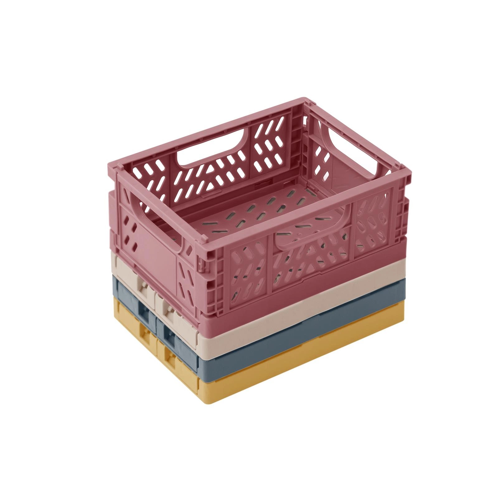 Zestaw 4 składanych, plastikowych skrzynek o wymiarach: 14 x 10 x 6 cm. Pomocny gadżet w dziecięcym pokoju do organizacji dziecięcych zabawek i akcesoriów. Sprawdzi się również do biura, w bagażniku samochodu oraz na zewnątrz. Lekka i trwała konstrukcja skrzynek została zaprojektowana tak, by można było układać je jedna na drugiej, co znacznie ułatwia uporządkowanie przestrzeni. Pusta skrzynka z łatwością składa się na płasko. Na bokach posiada uchwyty, które ułatwiją przenoszenie skrzynki w różne miejsca. W zestawie znajdziesz skrzynki w 4 różnych kolorach: niebieski, musztardowy, różowy i beżowy.