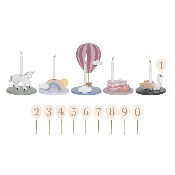 W zestawie znajduje się dziesięć balonów z cyframi do wyboru, w zależności od tego które urodziny świętujemy - do świeczników są sprzedawane osobno świeczki.