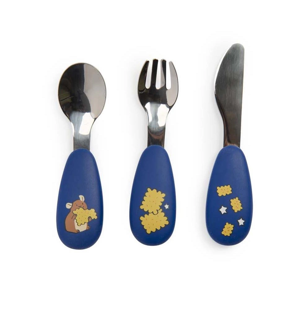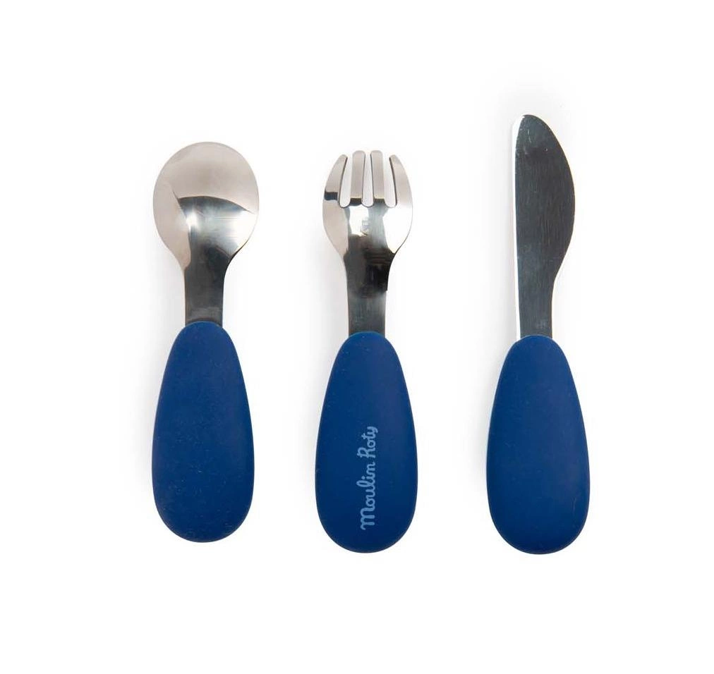 Zestaw sztućców dla dzieci ilustrowanych grafikami pochodzącymi z kolekcji Puce & Pilou. Widelec, łyżka i nóż wykonane są ze stali nierdzewnej, która jest materiałem bezpiecznym w kontakcie z żywnością. Silikonowe rączki zapewnią dziecku pewny chwyt.