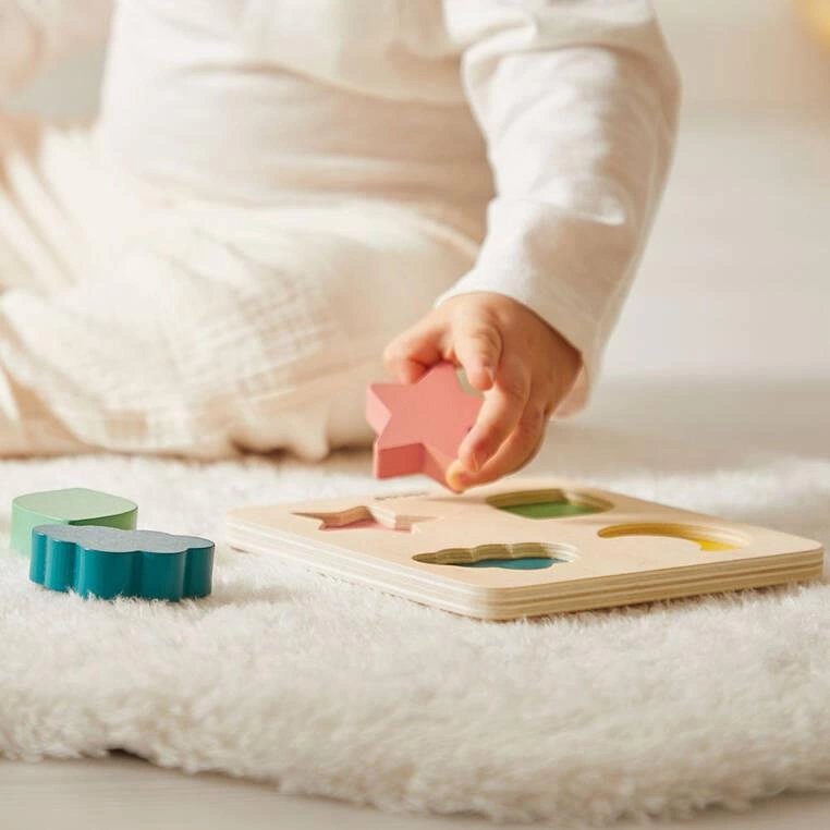 • płaski sorter kształtów z 4 klockami – wspiera trening umiejętności motorycznych i słownictwa, a także rozpoznawanie kolorów.
