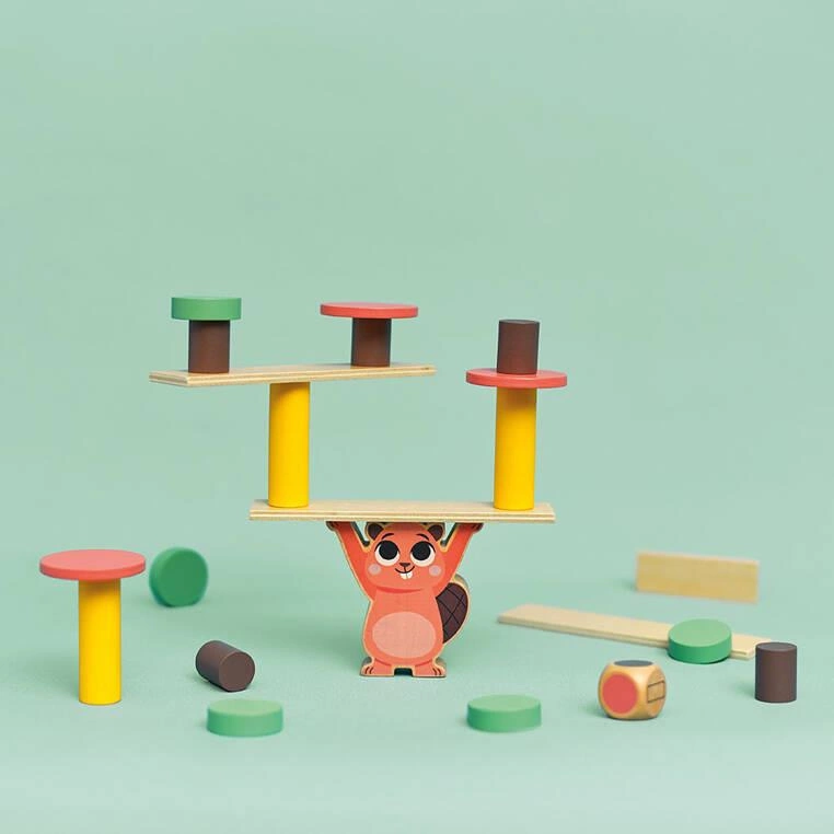 • zabawka zręcznościowa: bóbr do układania na nim elementów, wyrzuconych na kostce (w odpowiednim kolorze) lub wg własnego pomysłu – ćwiczy logikę, planowanie, małą motorykę i zręczność;