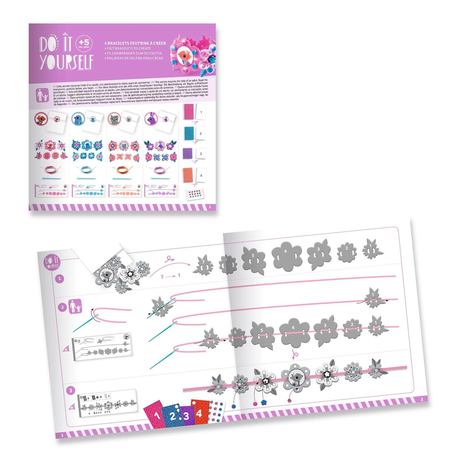 Zestaw zrób to sam do stworzenia 4 bransoletek przyjaźni, które można ozdobić połyskującymi piankowymi naklejkami i naklejkami w kształcie kolorowych kamyczków. Bransoletki wykonane z miłego w dotyku filcu, są przyjmne w noszeniu.