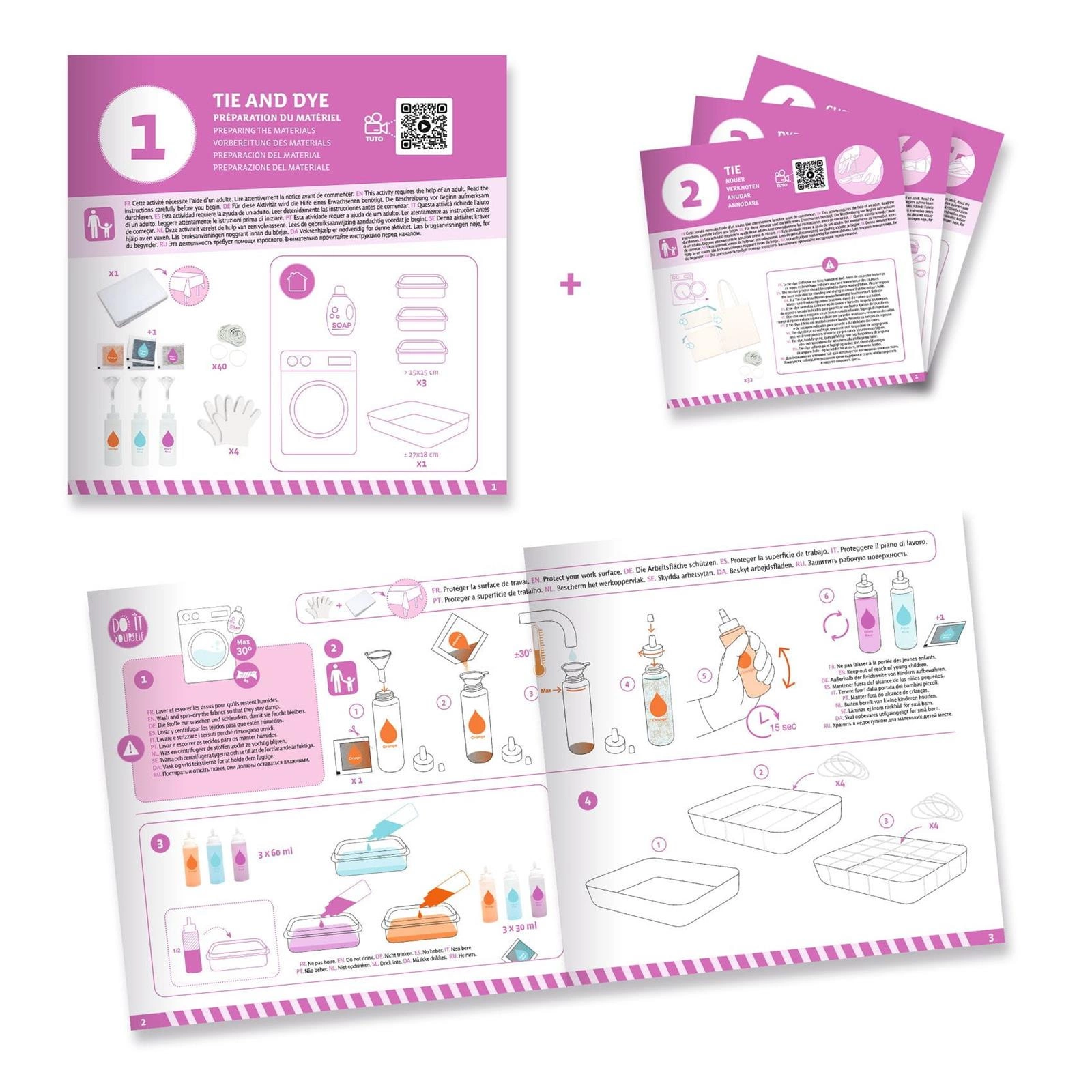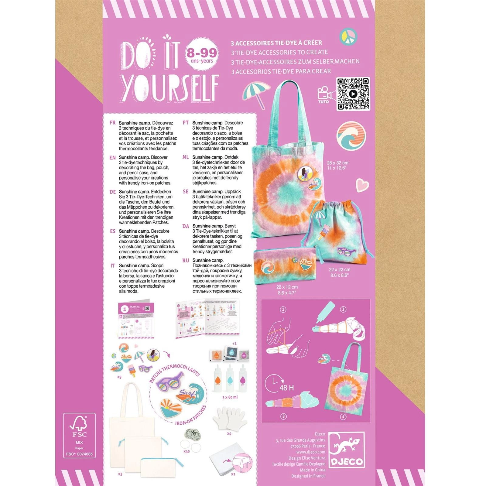 Zestaw artystyczny z serii Zrób to sam opierający się na metodzie tie&dye (z ang. zawiąż i pofarbuj). Zadanie polega na związaniu bawełnianego materiału gumkami recepturkami, pofarbowaniu go i wysuszeniu. Dzięki tej metodzie uzyskamy efekt nieregularnych kolorowych wzorów z efektem cieniowania. Do ozdobienia czekają bawełniana torba, worek-plecak oraz saszetka zamykana na zamek. Akcesoria można pofarbować na kilka sposobów: w geometryczne wzory, linie lub koła. Po wysuszeniu należy ozdobić materiał załączonymi do zestawu prasowankami w wakacyjne wzory.