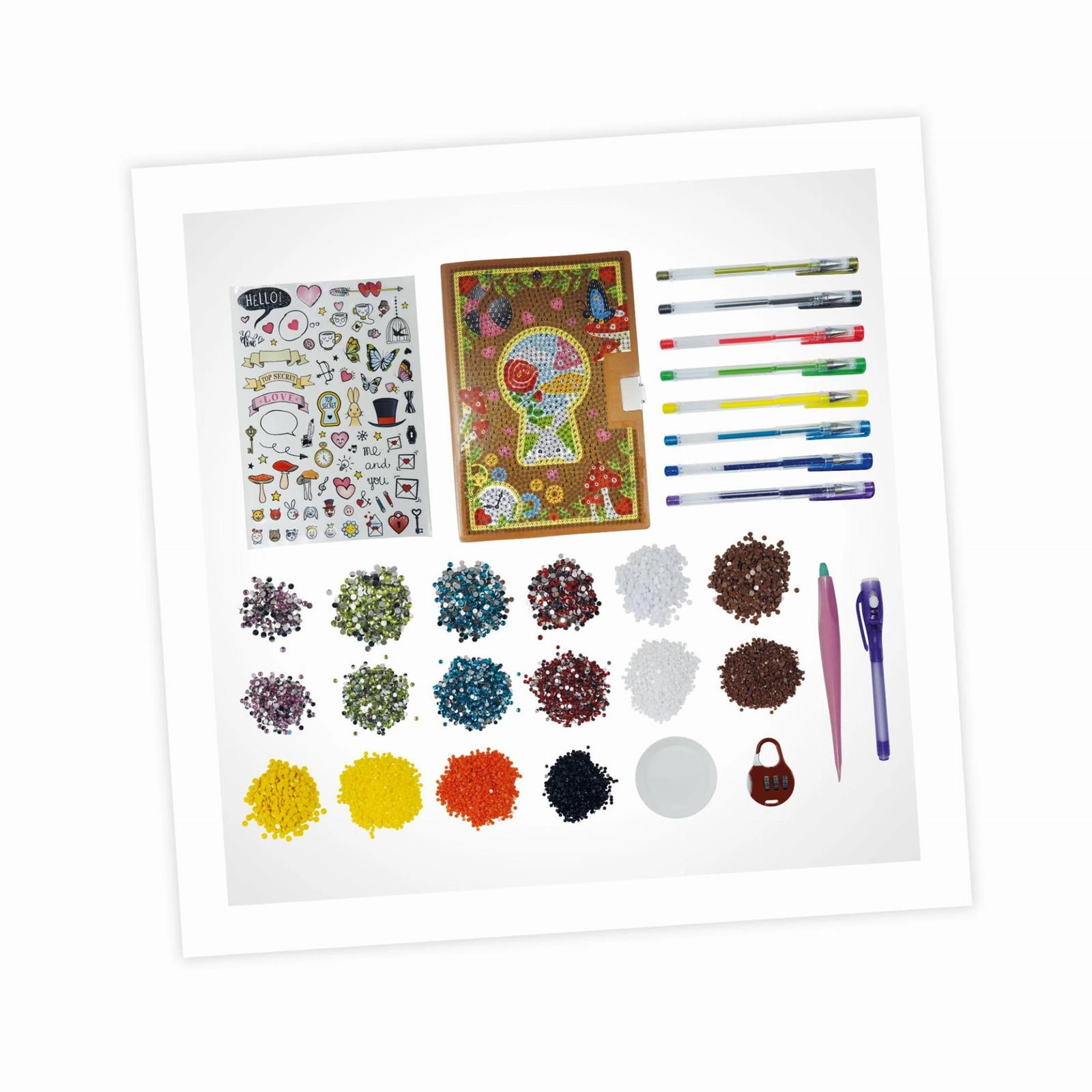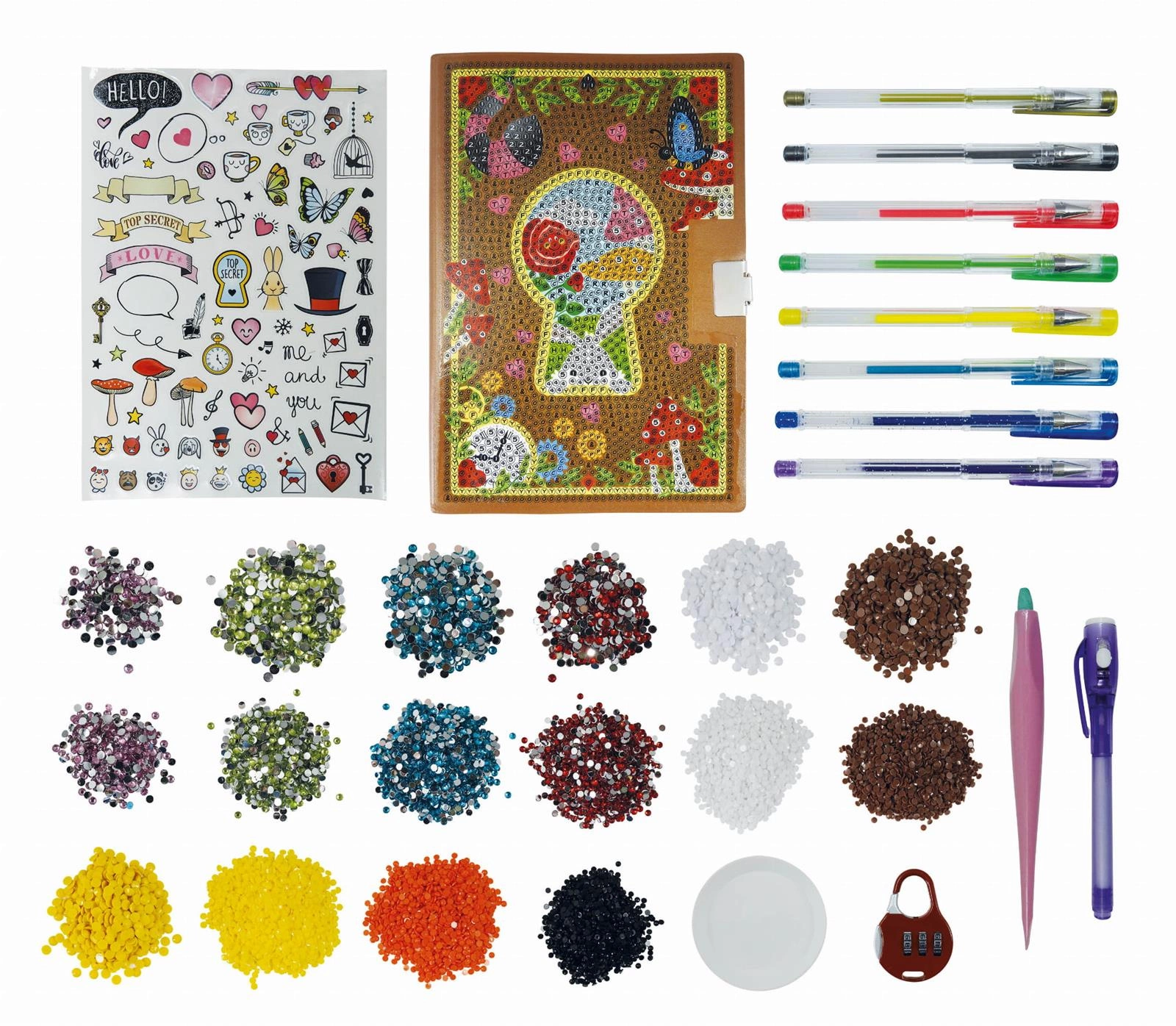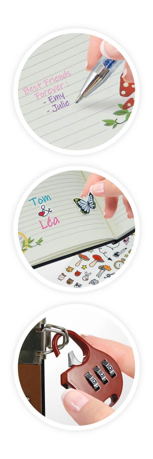 ma 120 stron ze zdobionymi kartkami, zawiera kłódkę na szyfr, magiczne pióro.