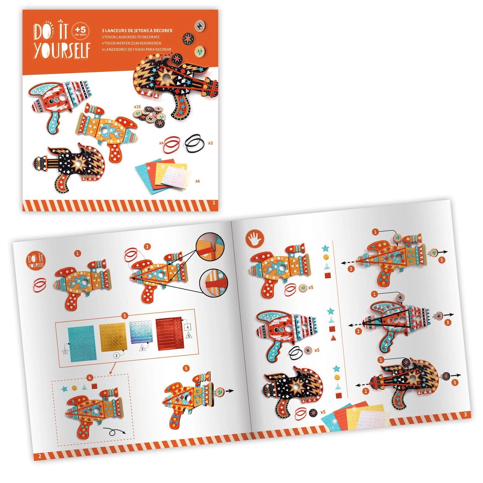 Zawartość: 3 wyrzutnie do żetonów z grubego kartonu, 15 żetonów, 6 gumek recepturek, 4 karty z piankowymi naklejkami, 1 instrukcja.