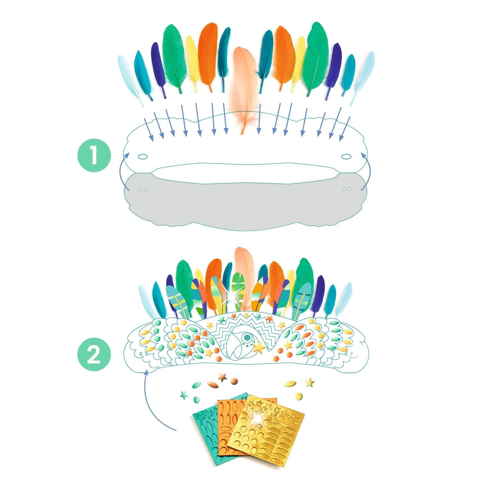 Zestaw kreatywny do stworzenia kolorowego pióropuszu udekorowanego naklejkami i piórami. Na pióropuszu znajduje się materiałowa część samoprzylepna, gdzie można umocować zjawiskowe pióra. Następnie należy zamknąć obręcz i ozdobić pióropusz załączonymi metalicznyminaklejkami, podążając za wzorem. Przebranie na miarę karnwału w Rio! Opaskapasuje na każdy rozmiar głowy. Idealny gadżet na imprezę urodzinową lubkarnawał. W zestawie instrukcja krok po kroku. Elementy zabawki wykonane zostały z papieru i kartonu posiadającego certyfikat FSC®.