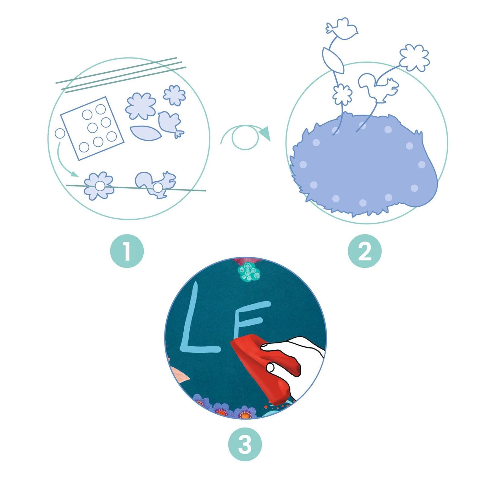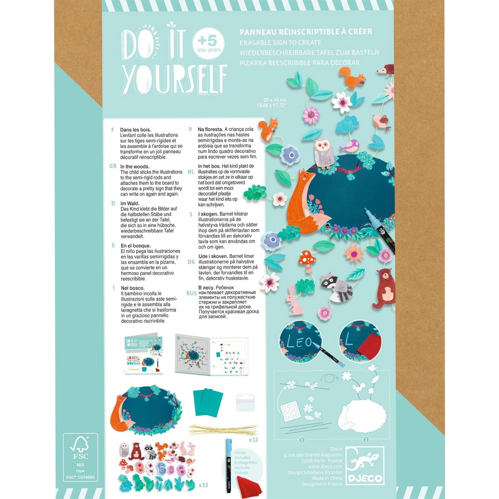 Zestaw artystyczny z serii Zrób to sam do samodzielnego stworzenia ścieralnej tablicy do zapisków ozdobionej uroczą ramką z motywem leśnym. Ilustracje należy przykleić na półsztywne druciki za pomocą piankowych naklejek i udekorować tabliczkę. Piękna i praktyczna ozdoba dzięcięcego pokoju. Zmywalny mazak i ściereczka są zawarte w zestawie. Powierzchnia tabliczki jest zabezpieczona przed zarysowaniem. Instrukcja krok po kroku ułatwi zadanie. Zestaw wykonany jest z papieru i kartonu posiadającego certyfikat FSC®.